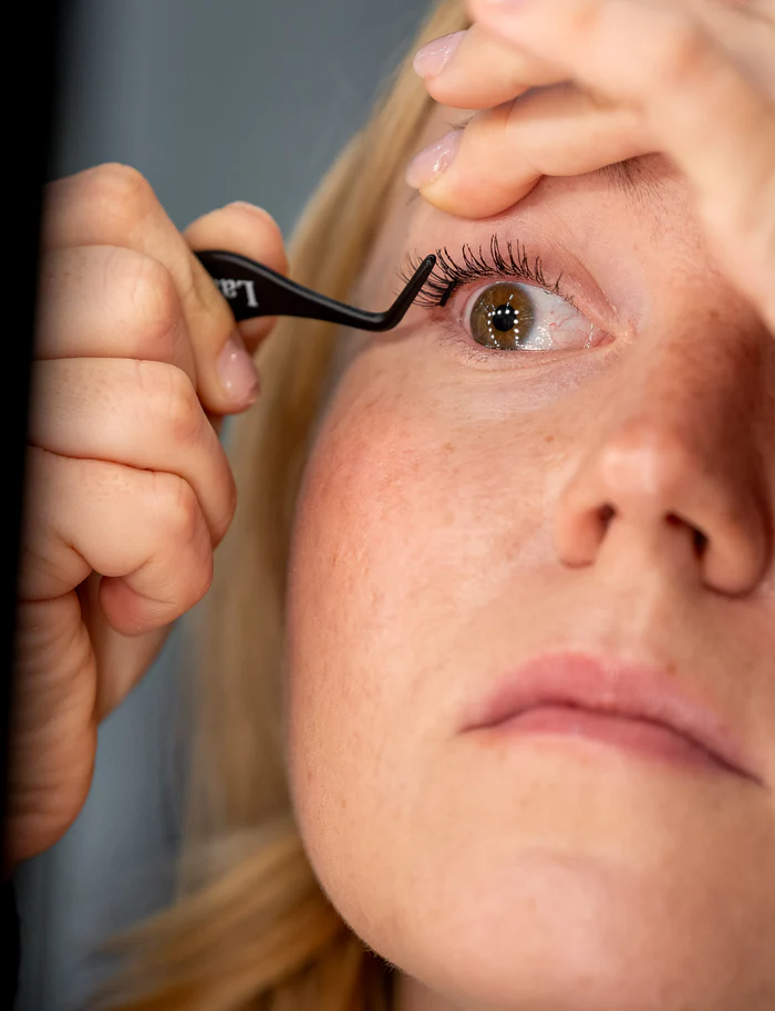 Nosta ripsipala pakkauksesta leveillä EASY-pinseteillä. Aseta ripsipala omien ripsien alle. Jätä millin verran rakoa limakalvoon. - Paina kiinni