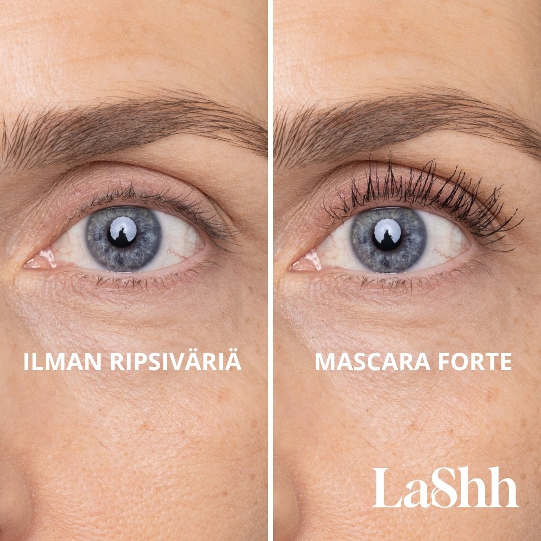 MASCARA FORTE on sinulle, joka haluat erittäin kestävän ja kauniisti erottelevan maskaran. FORTEn silkkimäiset kuidut pidentävät lyhyimpiä ja hennoimpiakin ripsiä. FORTE ei sisällä vettä, minkä ansiosta se pitää taivutukset täydellisesti, eikä suorista niitä kuten monet tavalliset ja 38°C-maskarat. Yhdellä kerroksella saat luonnollisen, erotellun lopputuloksen. Useammalla kerroksella rakennat näyttävämmän. FORTE kuivuu nopeasti ja sopii erinomaisesti käytettäväksi myös LaShh-lisäripsien alla. Anna maskaran kuivahtaa hyvin ennen ripsien kiinnittämistä, jotta liimapinta säilyy puhtaana.